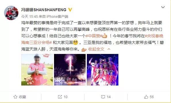 而在前一天的微博中,冯珊珊已经做了“预告”,自己将登上春晚舞.在《请到天涯海角来》的歌声中,数百人齐舞的热烈场面中,12位运动健将再度亮相与众人手拉手跳起舞蹈。作为**位拿到奥运会高尔夫项目奖牌(里约奥运会铜牌)的中国球手、**位获得大满贯**的中国内地球手、**位登顶世界**的中国内地球手,冯珊珊能够亮相央视春晚也算得上是对中国高尔夫人的肯定。